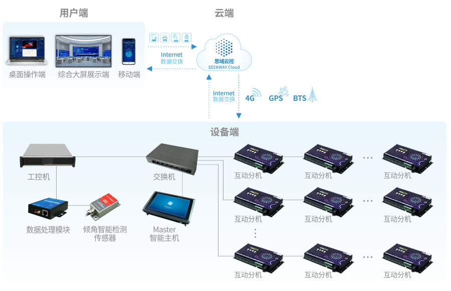 思域摩天輪燈光控制系統由思域云平臺、工控機、Master智能主機、摩天輪互動分機、數據處理模塊、傾角智能檢測傳感器等硬件組成。